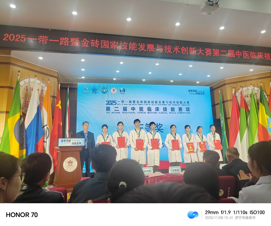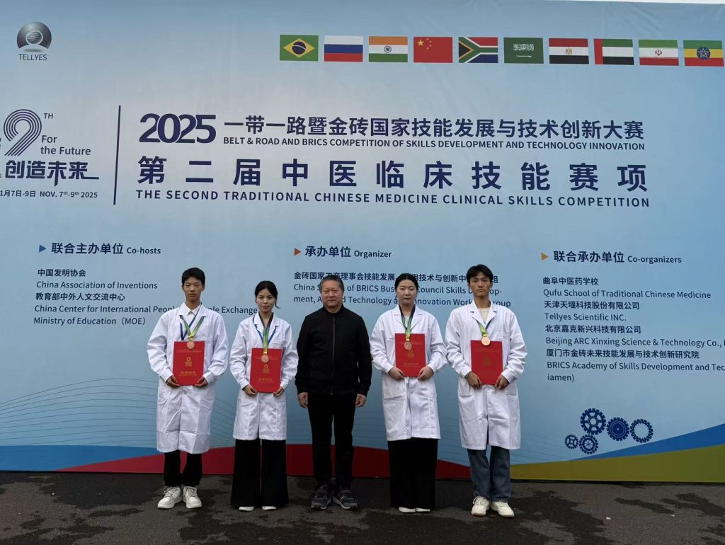 11月8日,从2025“一带一路”暨金砖国家技能发展与技术创新大赛第二届中医临床技能赛项的赛场传来喜讯,由我校杨智慧、贾文宇、李克朔、胡森林四位同学组成的参赛团队,凭借扎实的专业功底和出色的临场表现,荣获团体三等奖,展现了我校学子的专业素养和精神风貌。