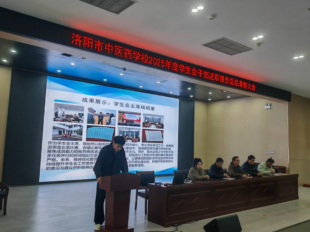 大会在庄严的国歌声中拉开序幕。首先,负责学生会工作的崔磊老师对学生会一年以来的整体工作进行了简要回顾与肯定。随后,大会进入核心环节——述职汇报。在热烈的掌声中,学生会主席杨绍康以其个人视角,作了充满深情与力量的总结述职。他深情回顾了团队半年来点滴进步的见证,从值班记录到跑操秩序,每一处细微改善都凝聚着成员心血。他感恩这段任职经历带来的锤炼与温暖,并表示无论将来身处何方,都将铭记“服务同学、锻炼自我”的初心。他衷心祝愿学生会能薪火相传、砥砺前行,在校园建设中贡献更多青春力量。